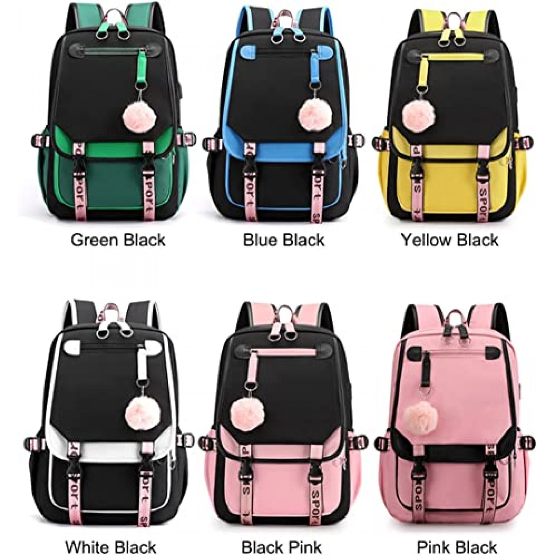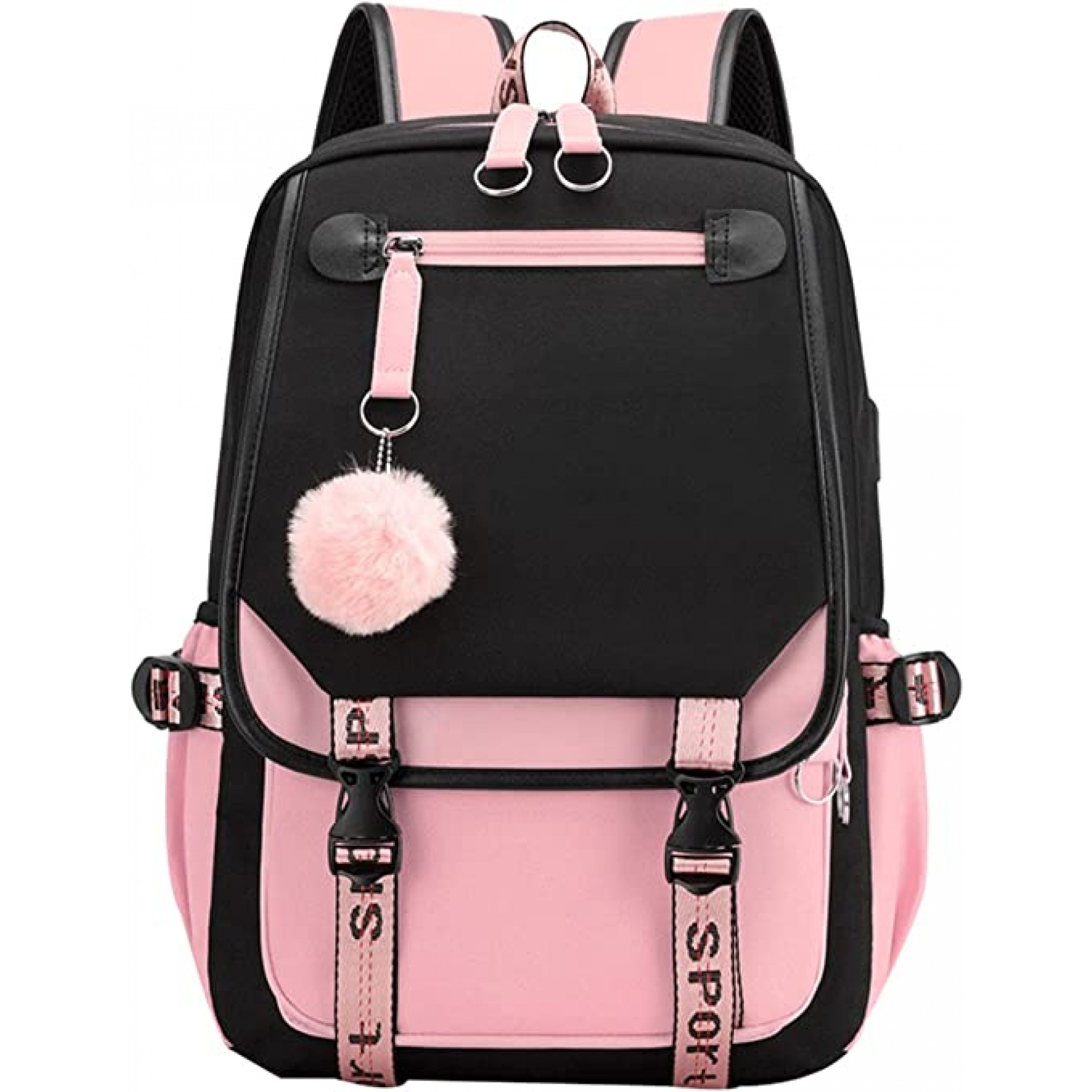 Mochila de chicas alumnas de escuela. Bolsa para libros para exteriores, mochila con puerto de carga USB, Computadora portátil, 4# Negro Rosa