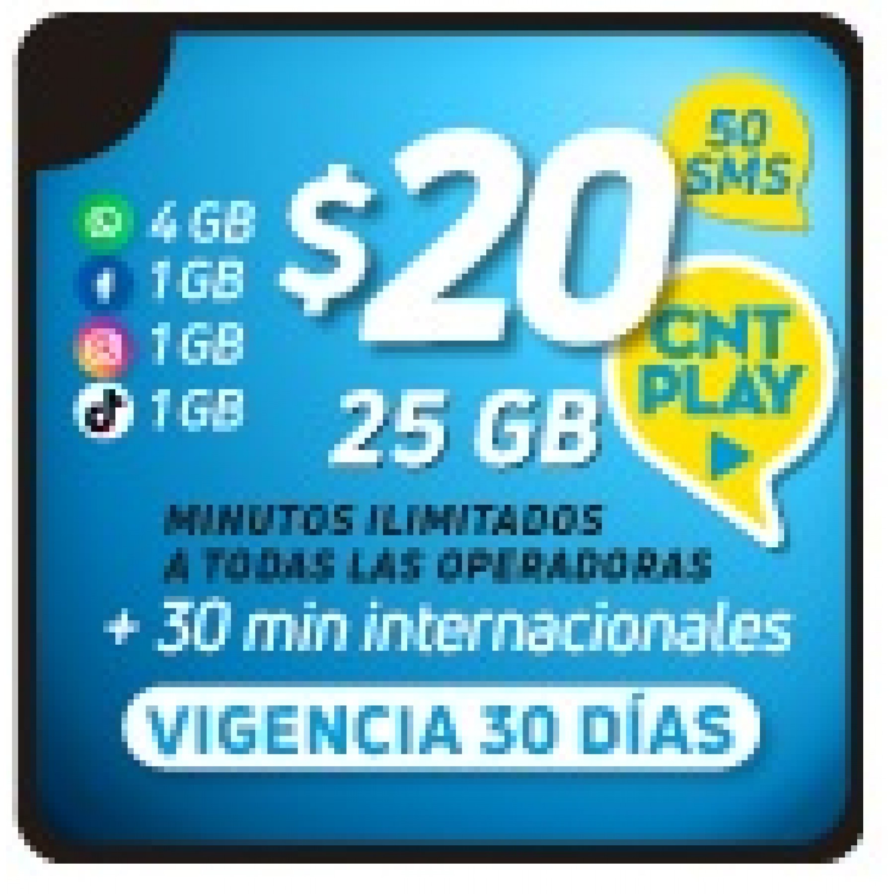 25 GB + min ilim todas operadoras + 30 min internacionales + 50 SMS + 7GB redes sociales + CNT Play 30 días x 30 días